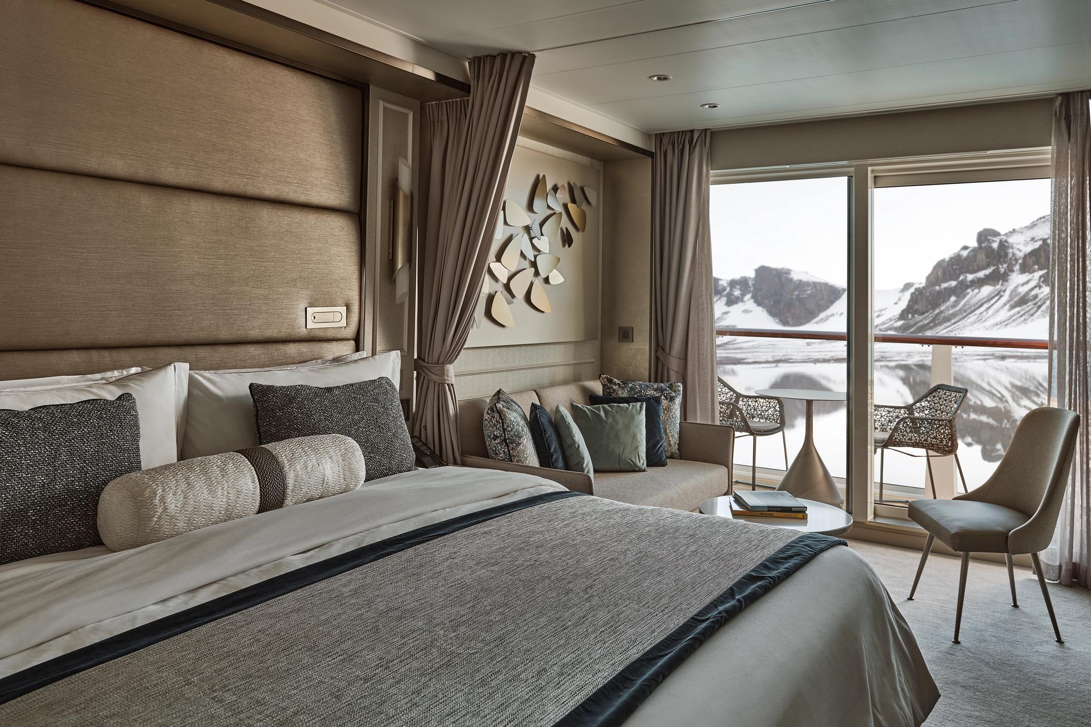 Cabin Superior Veranda Suite: The Superior Veranda Suite is found on the upper decks. From the sumptuous views from the teak veranda to the spacious sitting room (with a sofa bed able to accommodate a third berth) and large marble bathroom, everything about the Superior Veranda has been designed for your comfort. A comfortable living space, attention to detail, and a generous expanse of amenities make this stunning suite a cozy home while on the seas.
